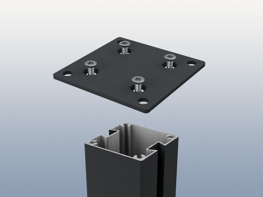 Die massive Bodenplatte aus Aluminium ist farblich auf die Nutpfosten abgestimmt. Passend zu jeder Bodenplatte liefern wir Ihnen vier Betonschrauben. Die Bohrlöcher für die Betonschrauben sind mit 8mm vorzubohren. Zum Verdecken der Schrauben liefern wir Ihnen noch passende PVC Schutzkappen in entsprechender Farbe und Menge mit.