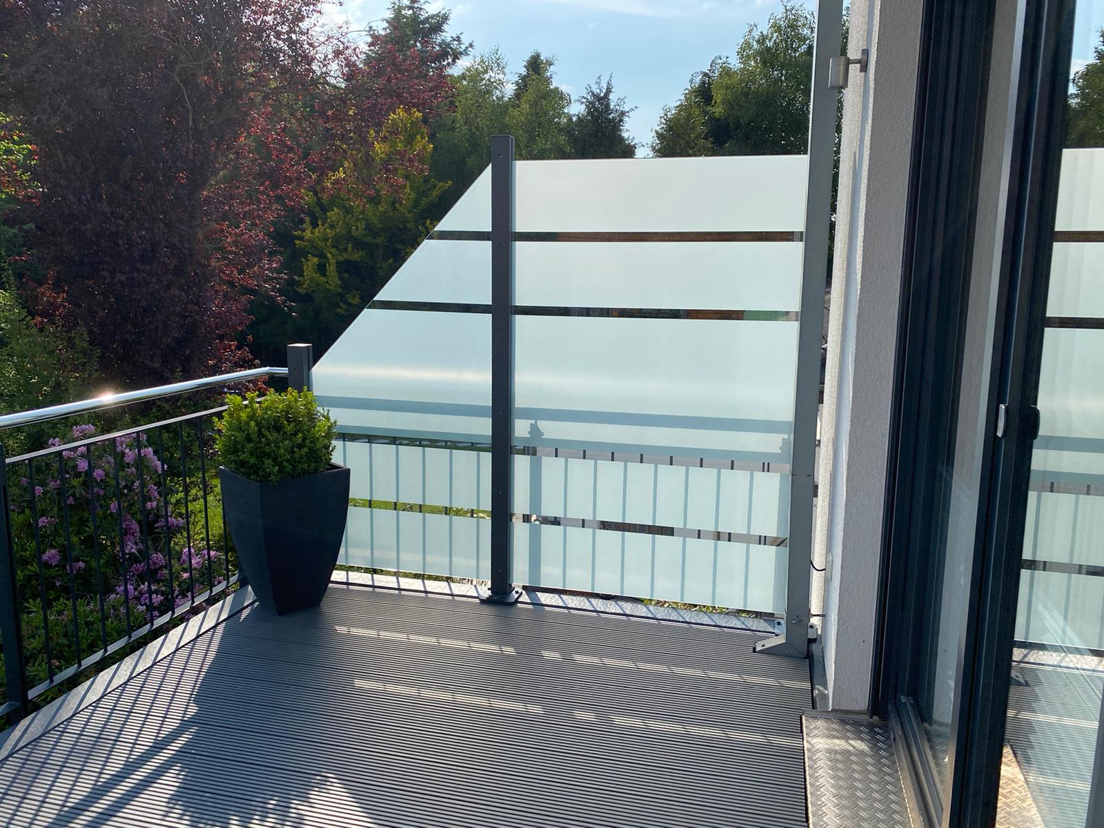 Sichtseite glatt, Rückseite satiniert mit vier durchsichtigen Streifen, 8 mm Sicherheitsglas geprüft nach EN 12150. Inkl. Dichtungsprofile aus Gummi.