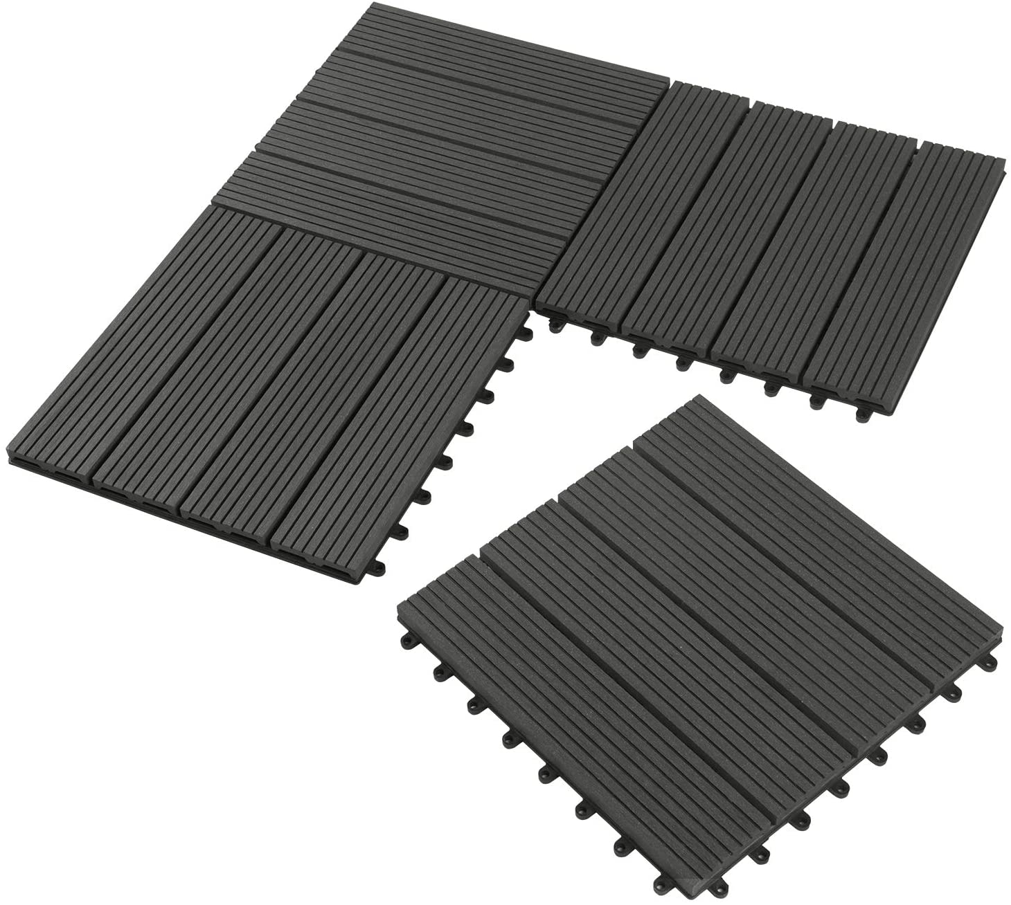 30 x 30 cm, barfußfreundlich, splitterfrei, pflegeleichte Oberfläche, belegt mit 4 massiven BPC-Lamellen in 10 x 72 x 300 mm, mit integriertem Stecksystem, daher schnell verlegbar, geringe Aufbauhöhe (21mm)