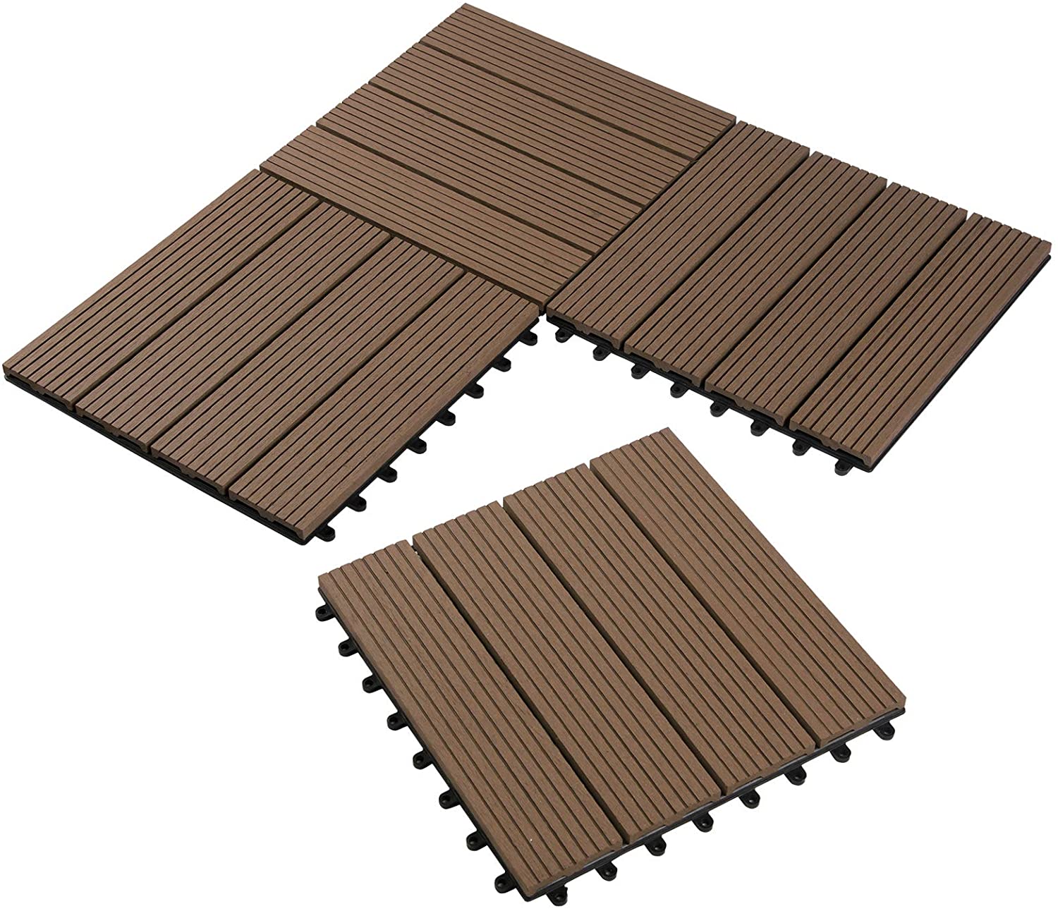 30 x 30 cm, barfußfreundlich, splitterfrei, pflegeleichte Oberfläche, belegt mit 4 massiven BPC-Lamellen in 10 x 72 x 300 mm, mit integriertem Stecksystem, daher schnell verlegbar, geringe Aufbauhöhe (21mm)