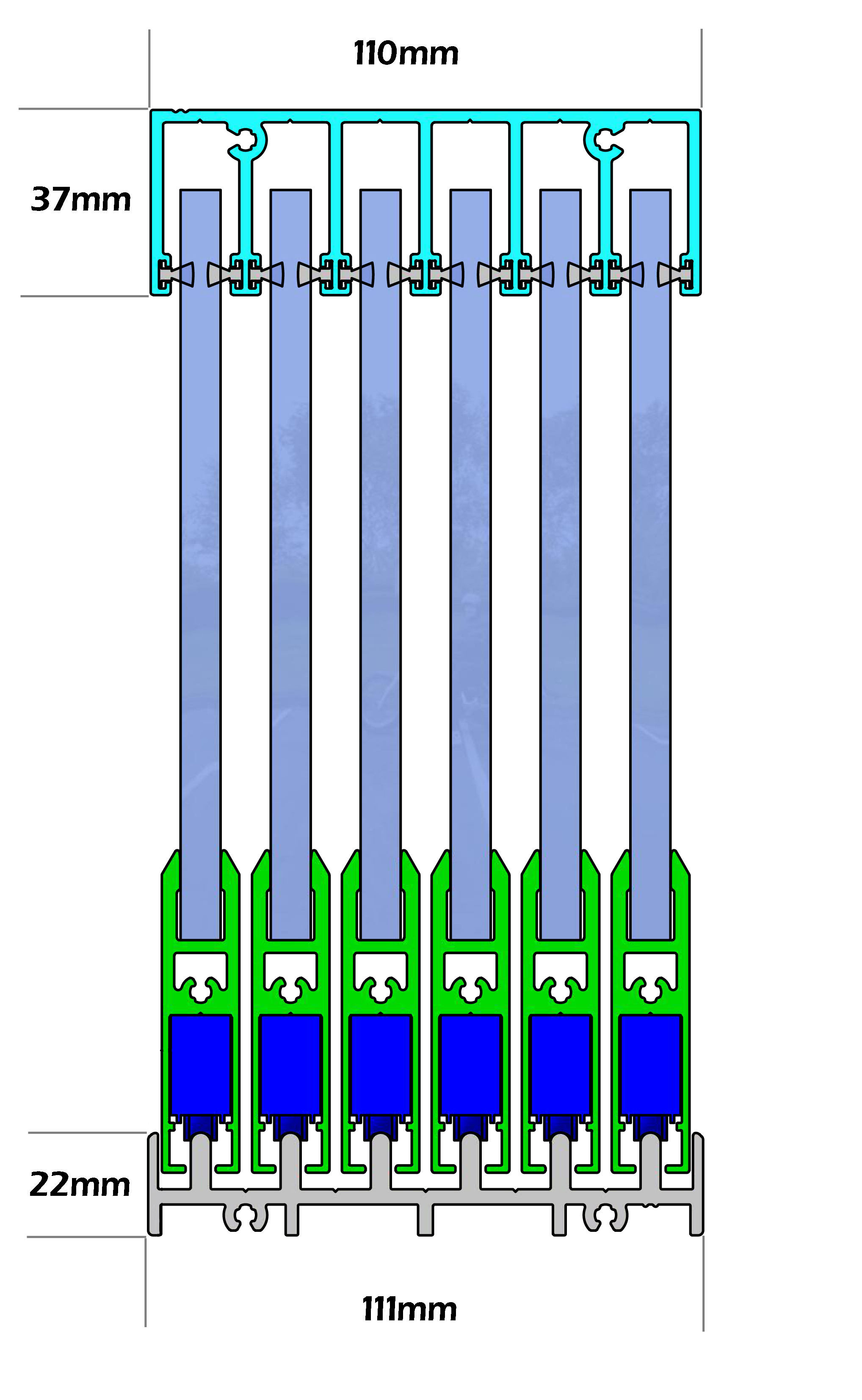 - wir gehen von einer Glasbreite gleich der Länge der Laufschlitten aus bei mehr als 4 Scheiben, können diese nicht zu einer Seite geschoben werden.
