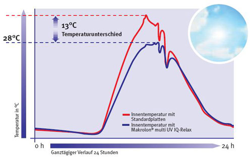 Im Vergleich zu handelsüblichen Standardplatten reduzieren diese Makrolon-Stegplatten die Hitze bezogen auf den Gesamtenergieeintrag um bis zu 50% bei gleichzeitig hohem Lichteinfall. Die Tests am Beispiel eines unbelüfteten/unbeheizten Wintergartens zeigten eine Reduktion im Innenraum um bis zu 13°C bei Nutzung von Makrolon-Stegplatten IQ im Vergleich zu Standardplatten. Das bedeutet: höchste Selektivität egal welches Wetter draußen herrscht.