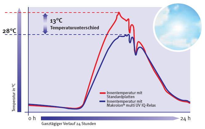 Im Vergleich zu handelsüblichen Standardplatten reduzieren diese Makrolon-Stegplatten die Hitze bezogen auf den Gesamtenergieeintrag um bis zu 50% bei gleichzeitig hohem Lichteinfall.